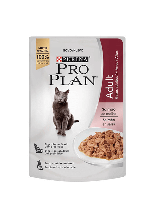 Pro Plan Pouch Feline Salmón en Salsa 85g: Nutrición completa y deliciosos trozos de salmón en salsa para gatos.